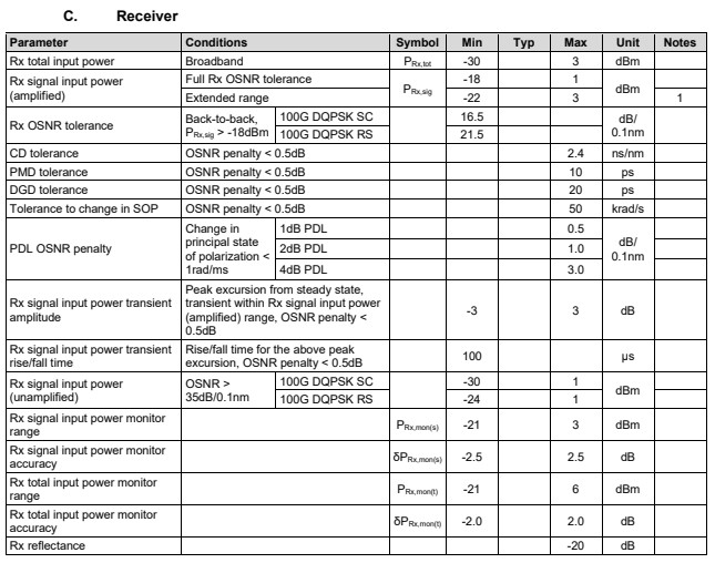 1. Faixa de potência de entrada do sinal Rx na qual o desempenho pode ser garantido com penalidade de OSNR <1dB em relação ao limite de tolerância de OSNR Rx
