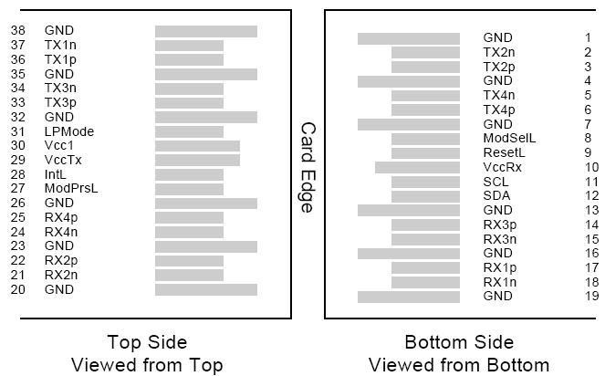 A porta de interface óptica é um conector MPO macho. As quatro posições de fibra à esquerda, conforme mostrado na Figura 2, com a chave para cima, são usadas para os sinais de transmissão óptica (canais 1 a 4). As posições de fibra à direita são usadas para os sinais de recepção óptica (canais 4 a 1). As quatro fibras centrais estão fisicamente presentes.