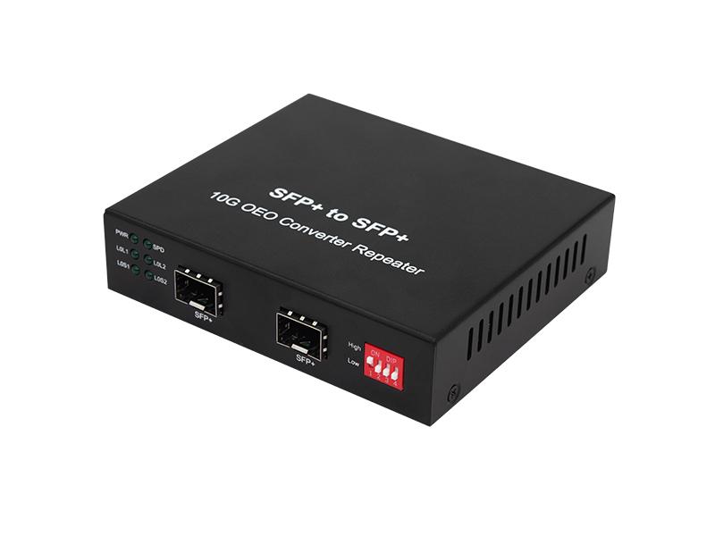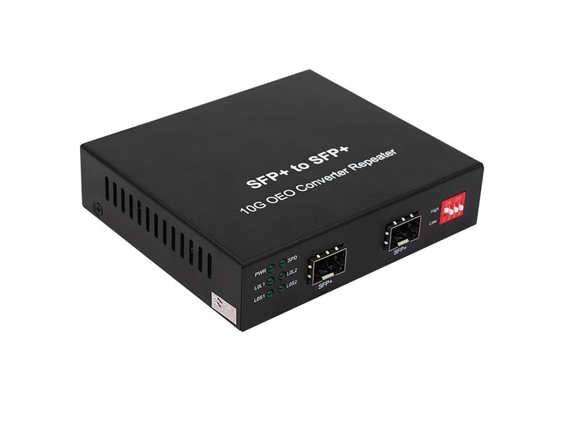 O conversor 10G é uma conexão entre equipamentos de fibra óptica de 10 Gbps, funcionando como conversor de mídia de fibra ou como repetidor de fibra para transmissão de longa distância. É compatível com backbone de rede (SAN, LAN, MAN), SDH/SONET STM-64/OC-192, Fibre Channel 10G e Ethernet 10G. Pode ser aplicado em salas de telecomunicações, laboratórios de P&D, data centers, etc. Realiza conversão de comprimento de onda óptica em 1310 nm/1550 nm/CWDM/DWDM.
