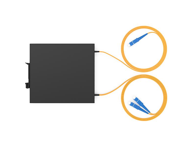 | 1P2-DG02U-2010 | Caixa de montagem DIN para fibra óptica PLC SC/UPC 1x2 de 2,0 mm e 1,0 m, dimensões 120 x 110 x 20 mm. |