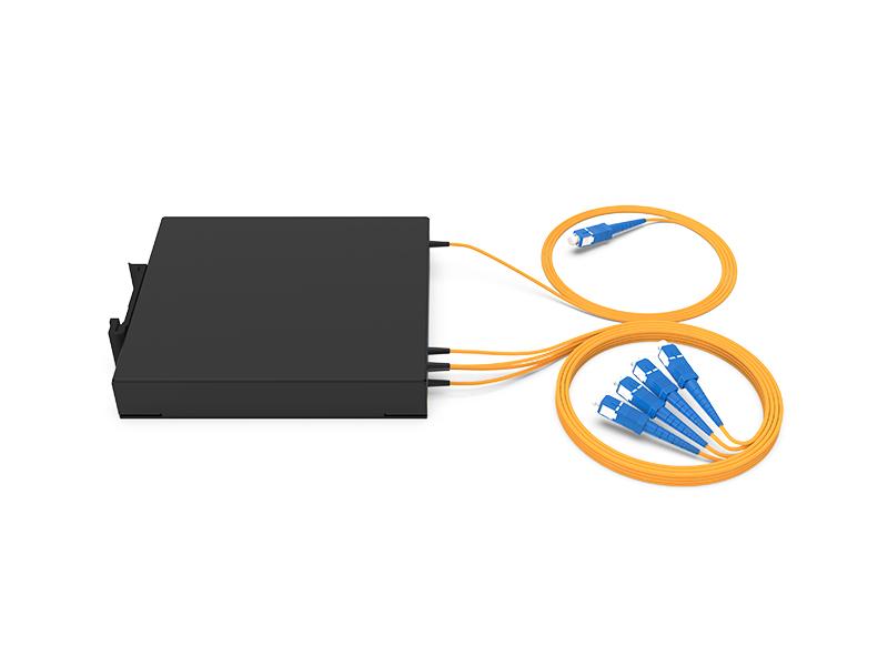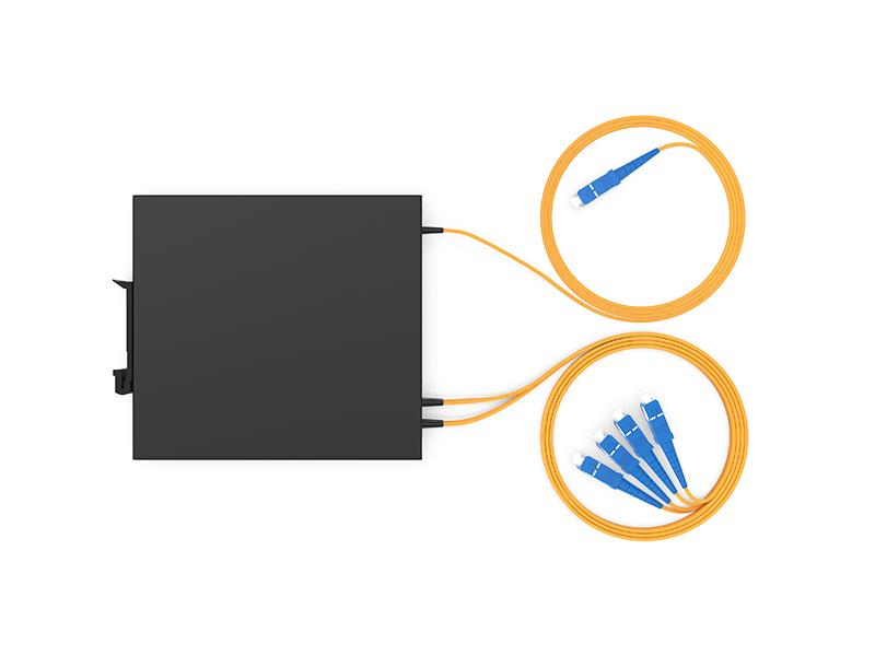 | 1P4-DG02U-2010 | Caixa de montagem DIN para fibra óptica PLC SC/UPC 1x4 de 2,0 mm e 1,0 m, dimensões 120 x 110 x 20 mm. |