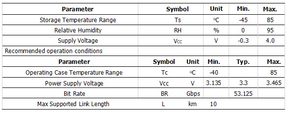 O RSFP56-50G-LR é um transceptor SFP56 de 50 Gb/s baseado em laser DFB de 1310 nm. Ele foi projetado para transmitir e receber dados ópticos em fibras monomodo a distâncias de até 10 km. O transceptor é compatível com as normas SFF-8472, SFF-8402, SFF-8432 e partes aplicáveis da SFF-8431. Funções de diagnóstico digital estão disponíveis através de uma interface serial de 2 fios, conforme especificado na norma SFF-8472.